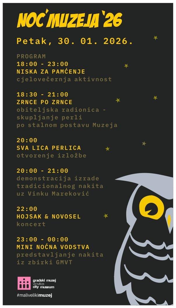 U petak, 30. siječnja, od 18 sati Gradski muzej Virovitica otvara vrata za još jednu Noć muzeja 2026. Ove godine program je posvećen nakitu i pričama koje skriva – od obiteljskih radionica do koncerata i mini noćnih vođenja.