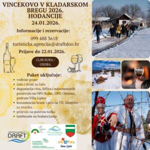 U sklopu manifestacije očekuju nas Vincekove hodancije – vesela šetnja kladarskim bregima uz obilazak vinograda, druženje, običaje i kušanje domaćih vina. Poseban dio programa je blagoslov vina koji će se održati na TIC Klopocu, uz simbolično rezanje trsja i očuvanje tradicijskih običaja.